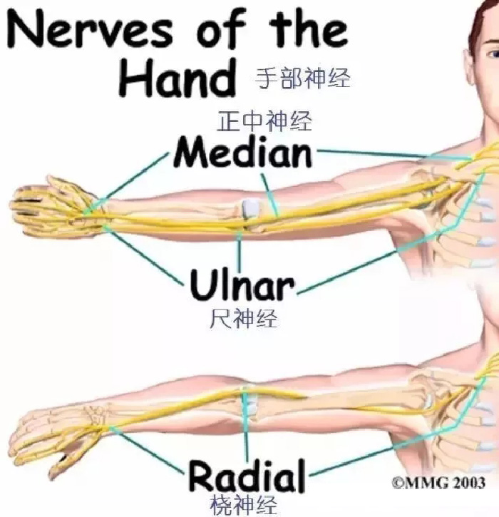 所有手部的神经都来自于肩部:桡神经、正中神经以及尺神经。这些神经传达着来自脑部的电信号来控制手臂、手、手指和拇指的运动。同时这些神经也将感觉的电信号如触觉、痛觉和温觉传导回大脑。